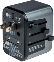 Rejs bekymringsfrit med den universelle adapter VERBATIM UTA-03. Med skydevælgere vælger du hurtigt stik for EU/UK/USA og roterende ben for AUS/CN, så du kan tilslutte dine enheder næsten overalt. Tre USB‑C-porte og to USB‑A samt gennemgående AC-stik gør det muligt at forsyne op til seks enheder samtidigt, fra smartphones og tablets til bærbare og kameraer.