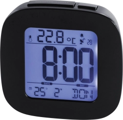 Den store skærm viser tid, dato, ugedag og temperatur. Bagbelysning sikrer god læsbarhed selv i mørke.