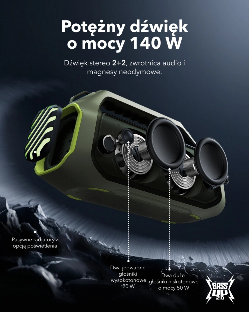 Soundcore Boom 2 Plus er skabt til udendørs underholdning: den leverer ren og høj stereo med tydelige detaljer takket være titanium-membraner med frekvensrespons op til 40 kHz. Den eksklusive BassUp analyserer musikken i realtid og forstærker de lave frekvenser for virkelig kraftig bas uden forvrængning.