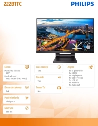 Philips 21,5" touchskærm kombinerer elegant design med den nyeste teknologi, ideel til både dagligt arbejde og underholdning. Takket være IPS-teknologi får du naturtro farver og stabil visning fra forskellige vinkler.