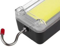 For maksimal fleksibilitet er lampen udstyret med en drejelig krog til ophængning, magneter til fastgørelse på metaloverflader og en klips i det drejelige håndtag til solid fastgørelse på bord eller hylde. Strøm fra to genopladelige batterier på 1200 mAh giver op til 4–6 timers drift, og opladning sker nemt via USB-kabel.