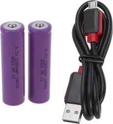 To batterier på 1200 mAh og USB-kabel medfølger. En opladning giver 4–6 timers lys – ideelt til service og camping.
