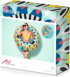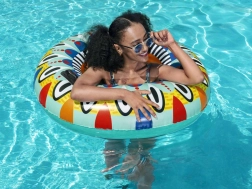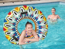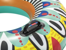 Baderingen Fiesta bringer stil og glæde tilbage i poolen med sin livlige grafik og farverige design. Med en diameter på 107 cm og to sorte håndtag for nemt greb sikrer den sikkerhed for børn fra 12 år og voksne. Den integrerede sikkerhedsventil gør det nemt at puste op og tømme, så opbevaring er en leg.