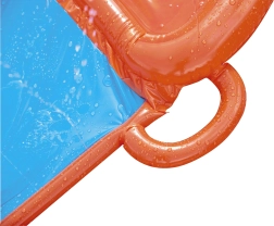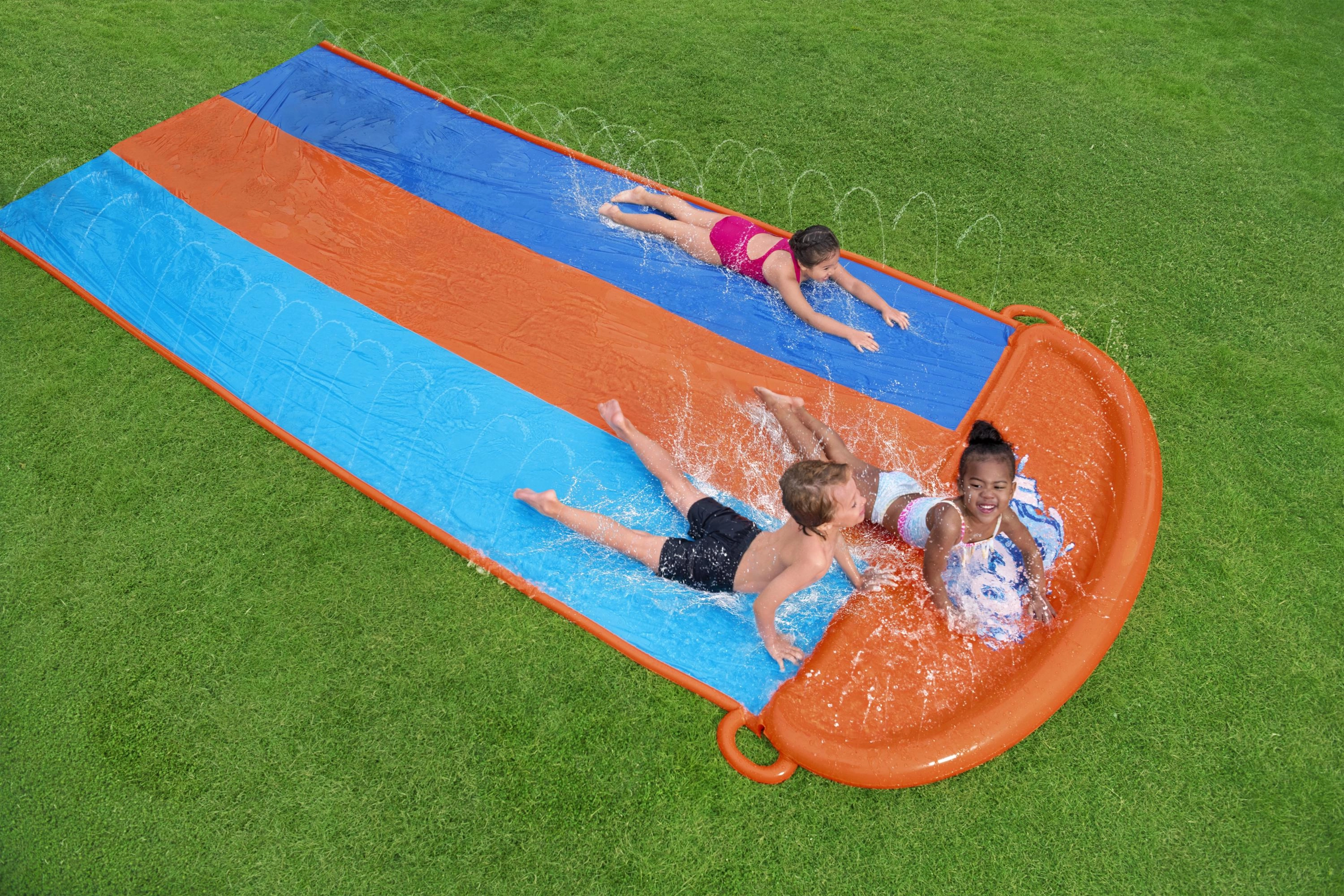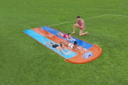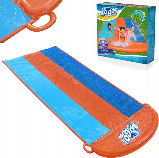 Arrangér hjemmebane-vandløb direkte i haven. Den tredobbelte BESTWAY-sklie tilbyder tre parallelle spor, så børn kan konkurrere side om side. Sidebrusere skaber en blid vandkaskade og holder overfladen perfekt våd for en hurtig og jævn glideoplevelse.