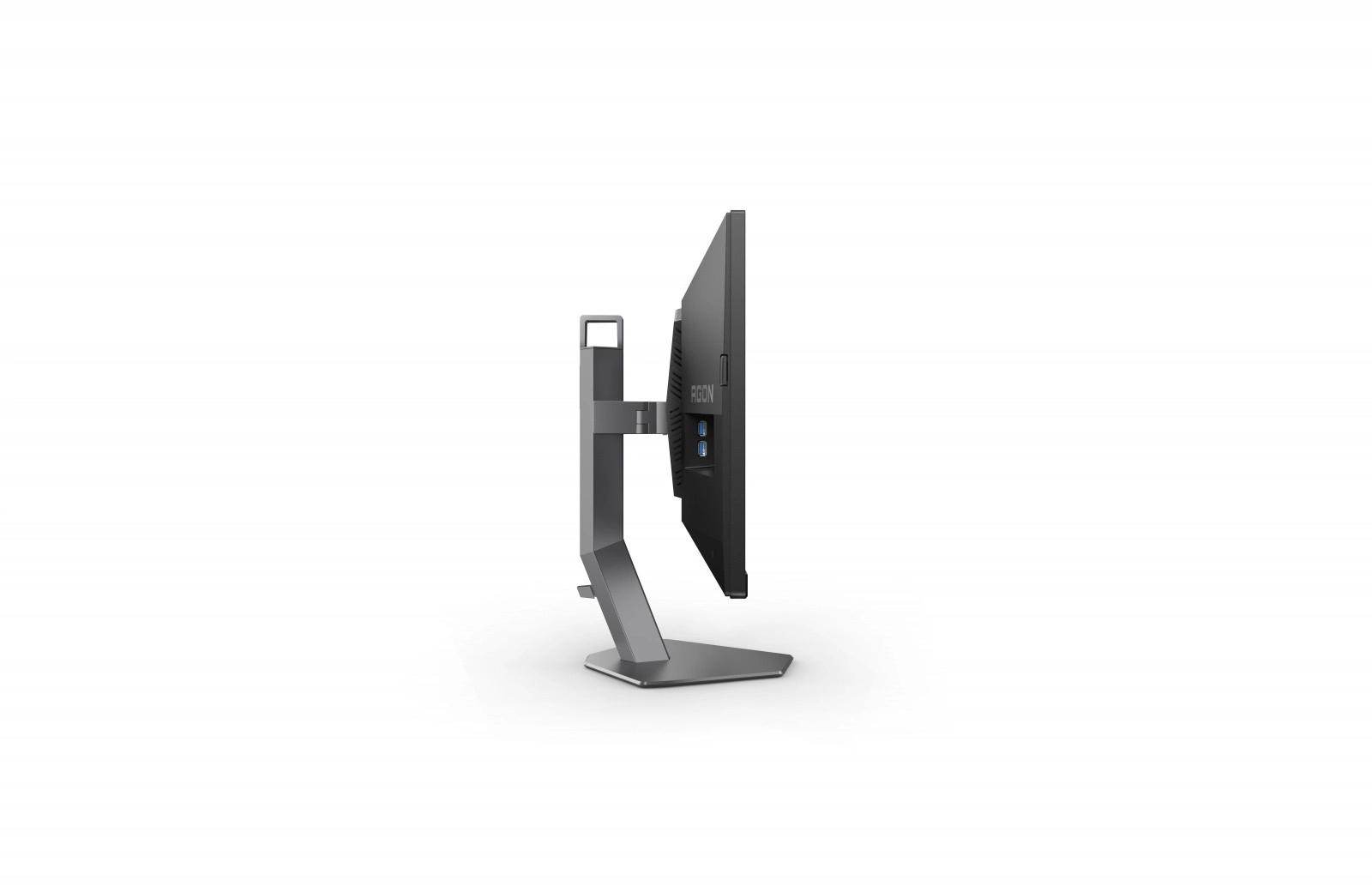 Skærmen har et minimalistisk design og er udstyret med en justerbar stander for ergonomisk brug.