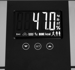 Vægten husker data for op til 10 personer og tildeler målingen til den rette profil via vægtgenkendelse (±3 kg). Valg af køn og tilstand (kvinde, mand, atlet) samt aktivitetsniveau 1–5 for mere præcise resultater.