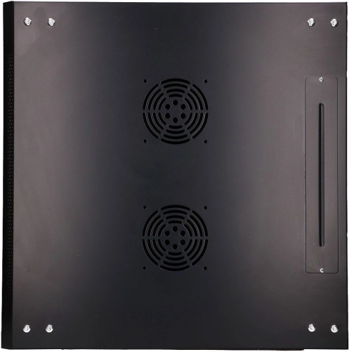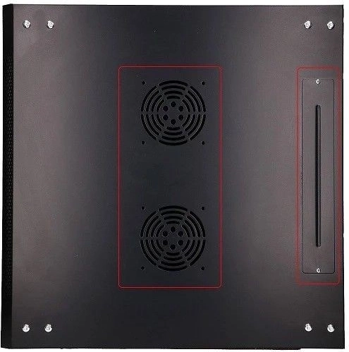 I toppen af skabet er der to udskæringer til installation af blæsere, som sikrer bedre køling af udstyret. Der medfølger også kabelgennemføringer for bedre kabelhåndtering.