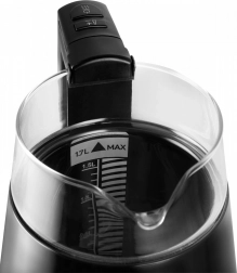 Kedlen er let at betjene og vedligeholde takket være det aftagelige låg med integreret filter mod kalkaflejringer og den store åbning til påfyldning af vand. Den glatte bund med skjult varmelegeme modvirker kalkdannelse, og den store vandstandsmåler giver et nemt overblik over vandmængden i kedlen. Den fuldt roterbare base tilbyder plads til opbevaring af overskydende kabel.