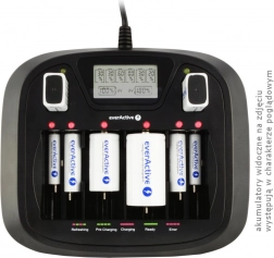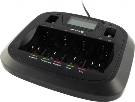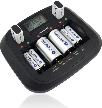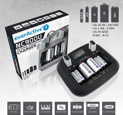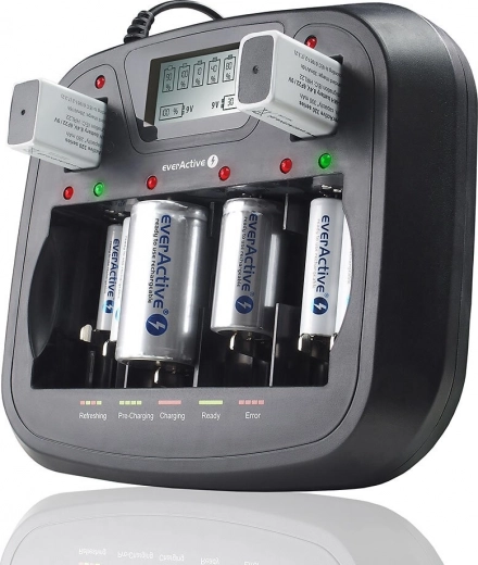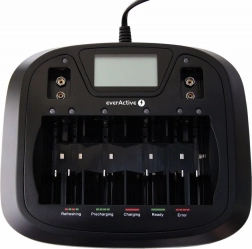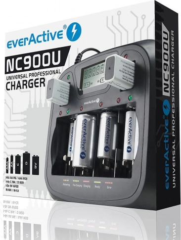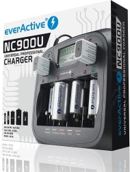 Leder du efter en oplader, der håndterer de fleste almindelige og større celler og lader dig oplade et ulige antal batterier? EVERACTIVE universal, processorstyret oplader tilbyder 8 fuldt uafhængige kanaler med intelligent styring. Takket være gendannelse (refresh) og afladning kan den forbedre tilstanden på dine Ni‑MH‑akkumulatorer og forlænge deres levetid.