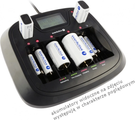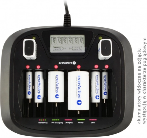 Kraftig universaloplader til EVERACTIVE-akkumulatorer med 8 uafhængige kanaler og et overskueligt LCD-display. Oplader uden besvær Ni‑MH AA/AAA/C/D samt 9V, understøtter gendannelse (refresh) og afladning og håndterer også enkeltceller og usædvanlige kombinationer. Selvfølgelig med USB‑port og LED‑statusindikator for hver slot.