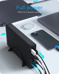 Tilslut periferiudstyr via 1× USB‑C og 2× USB‑A direkte på boksen. Spar porte på din bærbare og hav alt ved hånden.