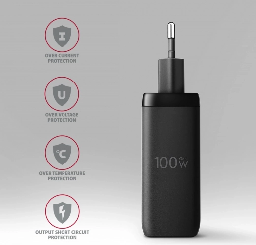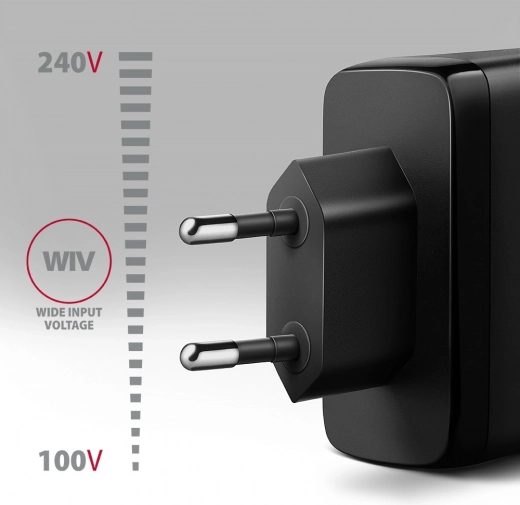 Axagon ACU‑DPQ100 er en universel oplader med en maksimal effekt på 100 W, som kan forsyne en laptop, telefon og høretelefoner på samme tid. To vendbare USB‑C-porte med Power Delivery og en klassisk USB‑A med Quick Charge sikrer den højest mulige opladningshastighed. Moderne GaN-teknologi giver højere effektivitet og mindre dimensioner – den ideelle løsning til rejser og skrivebordet.