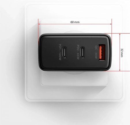 - 3 porte: 2× USB‑C (PD op til 100 W) + 1× USB‑A (QC op til 30 W)