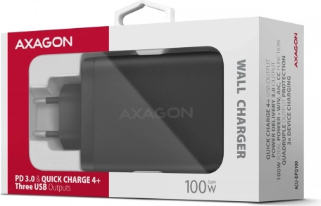 AXAGON vægoplader GaN 100 W, 3 porte (USB‑A + dobbelt USB‑C), sort