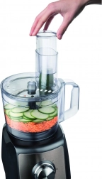 Denne multifunktionelle køkkenmaskine er en ideel hjælper i ethvert hjem. Med den rummelige plastskål på 1,5 l og kombinationen af to hastigheder og pulsfunktion klarer den nemt hakning, blanding, æltning, piskning, knusning og purering. Takket være de rustfri stålskiver og citruspresse-keglen laver du friske salater, revet ost og hjemmelavede juicer.