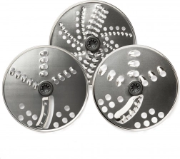 Sættet med tre dobbeltsidede rustfri stålklinger giver forskellige grader af rivning og skæring. Klarer grøntsager, ost og nødder og sikrer ensartede resultater.