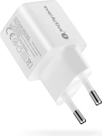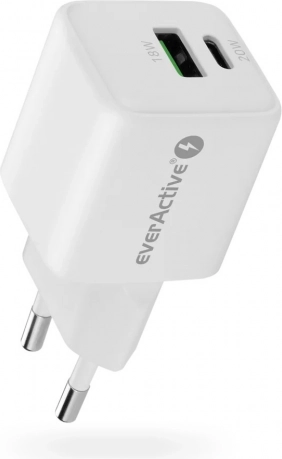 Hvid everActive GaN-oplader med USB- og USB-C-porte, 20W QC3.0, kompakt og ideel til rejser.