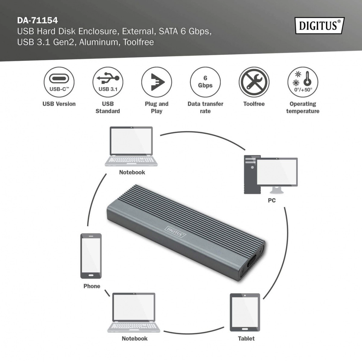 Oplev stabil ydeevne og høje hastigheder med USB 3.1 Gen 2 og den kvalitetsrige JMS576B‑chipset. Aluminiumskabinet i Pantone 430C leder varmen effektivt og beskytter dine data ved daglig brug. En integreret LED‑indikator for aktivitet gør det nemt at se diskens status.