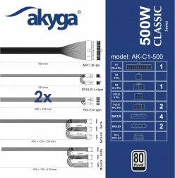 Leder du efter en effektiv og stille strømforsyning til en moderne PC? Akyga ATX 500 W Classic leverer op til 468 W på +12 V-skinnen til krævende processorer og grafikkort, opfylder 80 PLUS-standarden for højere effektivitet og lavere varmeudvikling og bruger flade kabler for nem installation selv i kabinetter med bundmonteret PSU.