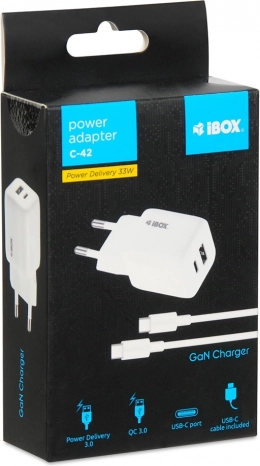 iBox C-42 er designet til de nyeste opladningsstandarder, inklusive Power Delivery 3.0 og Quick Charge 3.0. Takket være GaN-teknologien er den mere kompakt og effektiv end traditionelle opladere, hvilket sikrer, at enheder ikke overophedes under opladning.