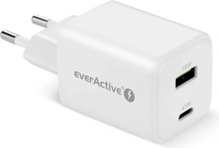 To udgange – USB‑C PD/PPS 45 W og USB‑A QC4+ – giver dig fleksibel opladning af forskellige enheder. Det brede indgangsområde 100–240 V / 50–60 Hz sikrer brug i hele verden. Den meget effektive konstruktion opfylder strenge energistandarder og minimerer både opvarmning og forbrug i standby-tilstand.