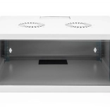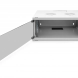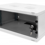 Kompakt væghængt 19" rackskab DIGITUS 4U til SOHO og små servere med robust stålkonstruktion, låselig glasdør, nem montering og fleksibel kabelhåndtering via gennemføringer i top og bund. Ideelt til routere, switche og aktive enheder med sikker og overskuelig placering.