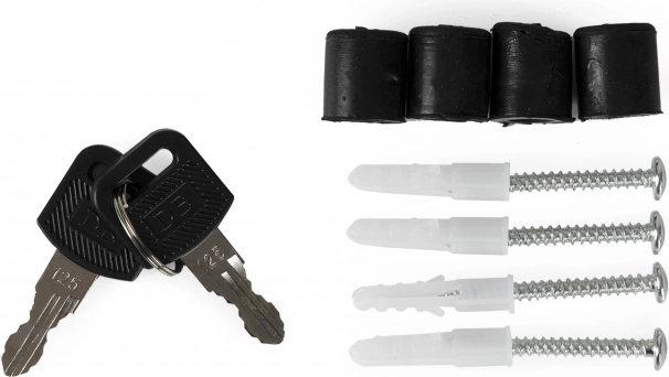 Pakken inkluderer et montagesæt med fire pløkker og afstandsstykker, hvilket gør det muligt for øjeblikkelig installation efter udpakning. Kassen indeholder to nøgler for øget sikkerhed.