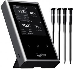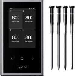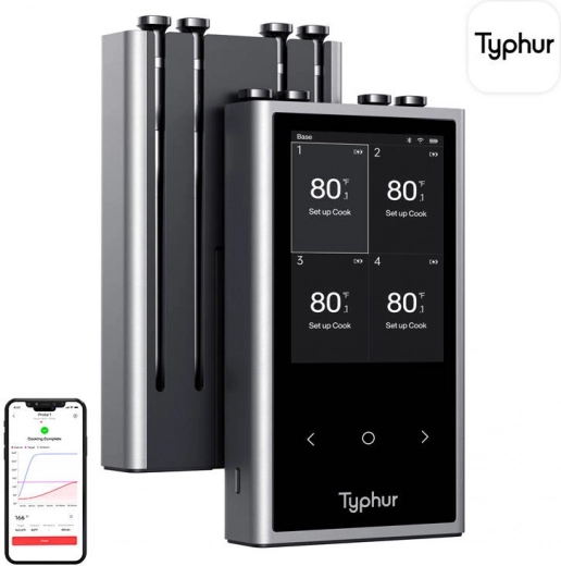 Her er det nyeste trådløse termometer Typhur Sync Quad, der sikrer utrolig nøjagtighed og pålidelige målinger. Takket være Bluetooth 5.3-teknologi er det muligt at overvåge temperaturen i realtid via mobilapp. Dette termometer tilbyder maksimal komfort og fleksibilitet i madlavningen.