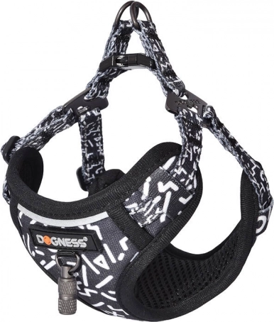Det stilfulde sort/hvide Dogness-sæt kombinerer en 1,5 m line og en behagelig sele til daglige gåture. Takket være kombinationen af holdbart nylon, åndbart mesh og robuste metaldele i zinklegering tilbyder det maksimal komfort og sikkerhed for både dig og din hund.