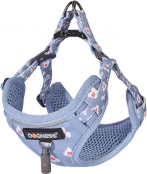Den lette, blødt polstrede og justerbare sele tilpasses nemt hundens krop. Sikker fastgørelse sikres af en metalring og en pålidelig karabinhage. Det moderne lyseblå design med et diskret blomsterprint giver jeres gåture stil.