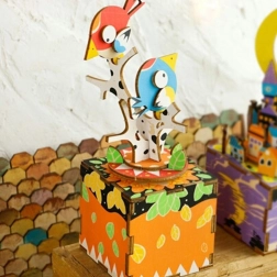 Nyd at bygge en detaljeret, farverig model af et fuglepar på en gren, som efter færdiggørelse vil live din hylde op med behagelig lyd og blid bevægelse. Trædele af høj kvalitet med præcist tryk passer nøjagtigt sammen og danner sammen med metaldele en stabil mekanisk spilledåse.