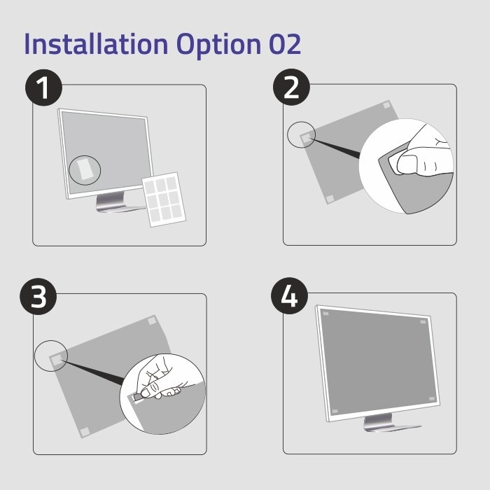 Nem installation og materialer af høj kvalitet sikrer, at din skærm forbliver ren og ubeskadiget. Filteret kan nemt monteres med klips, der fæstnes på skærmens ramme, eller med gennemsigtige strimler direkte på skærmen.