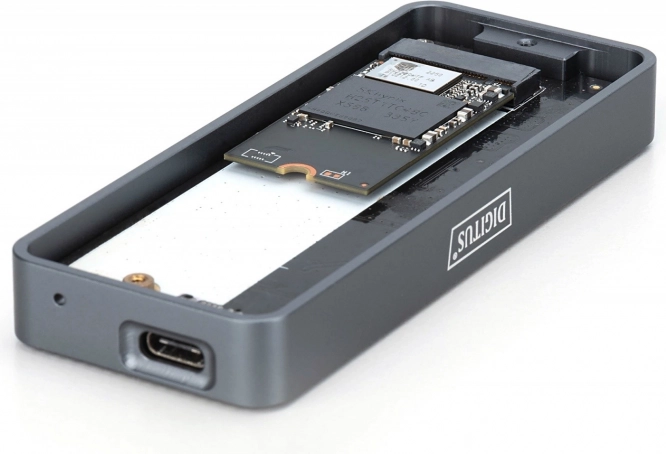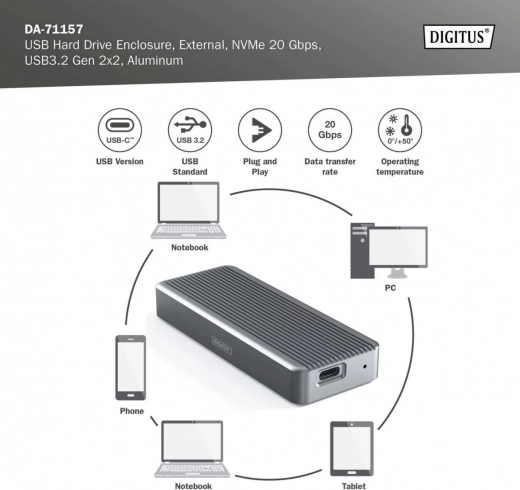 Dette aluminiums kabinet til M.2 NVMe-diske er det ideelle valg til hurtig ekstern lagerplads. USB-C / USB 3.2 Gen 2x2-grænsefladen giver båndbredde op til 20 Gb/s til lynhurtig kopiering af store filer og flydende databehandling. Takket være den værktøjsfri konstruktion klarer du monteringen på et øjeblik.