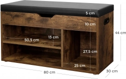Bænken er udstyret med tre hylder - to brede hylder (50,5x13 cm), en smallere hylde (25x27,5 cm) og yderligere opbevaring under sædet (80x30 cm). Den moderne loft stil tilføjer kant til interiøret.