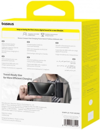 Den kompakte Baseus-powerbank med en kapacitet på 5000 mAh og effekt på 20 W oplader pålideligt din telefon og dine høretelefoner, uanset hvor du er. Den tilbyder tovejs hurtigopladning, en integreret USB‑C‑stik, tydelige LED‑indikatorer og flerlags beskyttelse for sikker brug – alt i et let og lommevenligt design.
