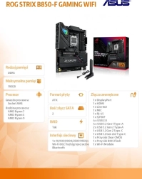 ROG Strix B850-F Gaming WiFi udvider AMD-platformens muligheder med topklasse strømlevering, effektiv køling og intelligente optimeringer. Høj USB‑båndbredde inklusive 20 Gb/s, nyeste Wi‑Fi 7 og 2,5Gb Ethernet sikrer lynhurtig tilslutning til periferi, lager og netværk. Kortet er klar til krævende builds med flere drev og hurtig grafik, samtidig med at det bevarer ønsket stabilitet og lave temperaturer.