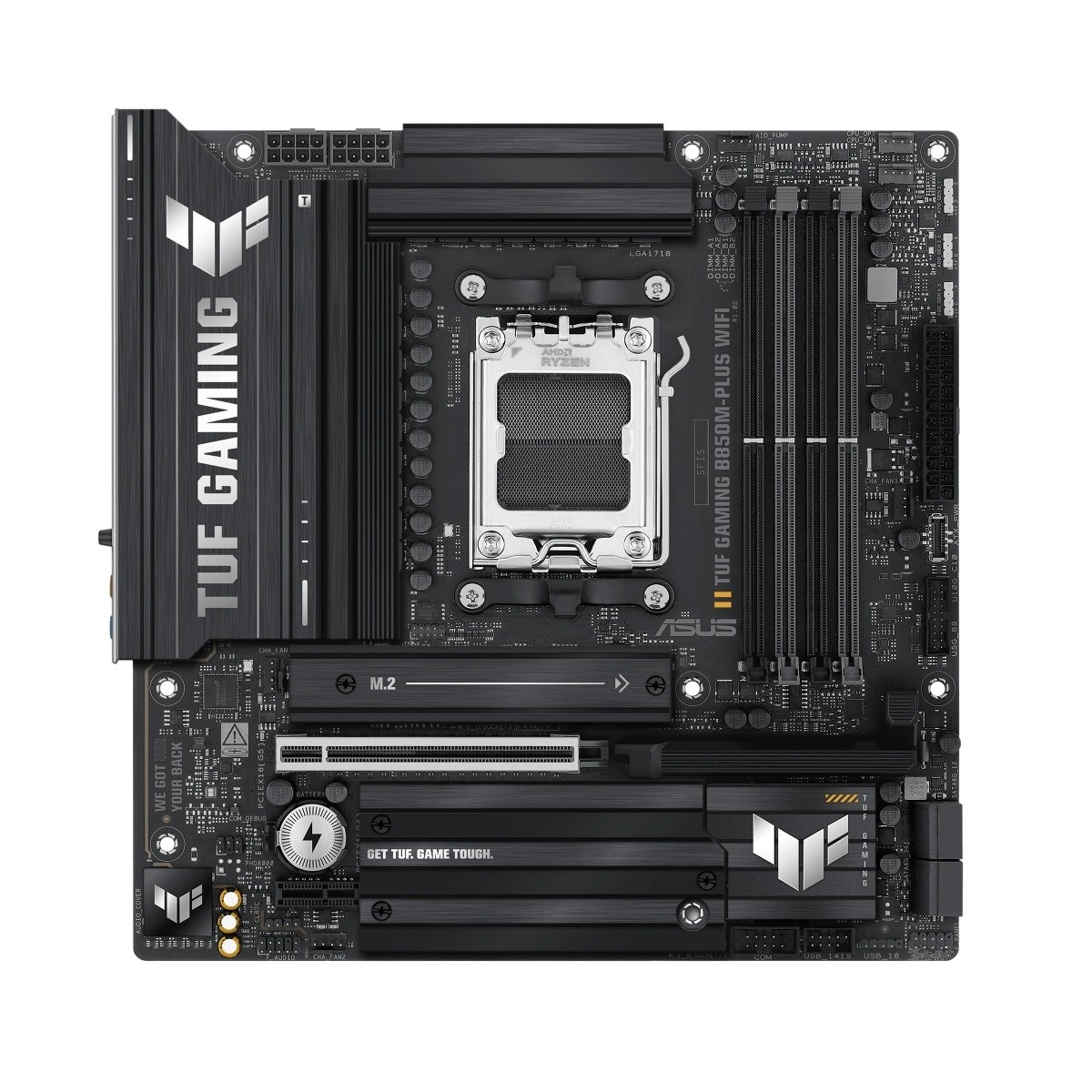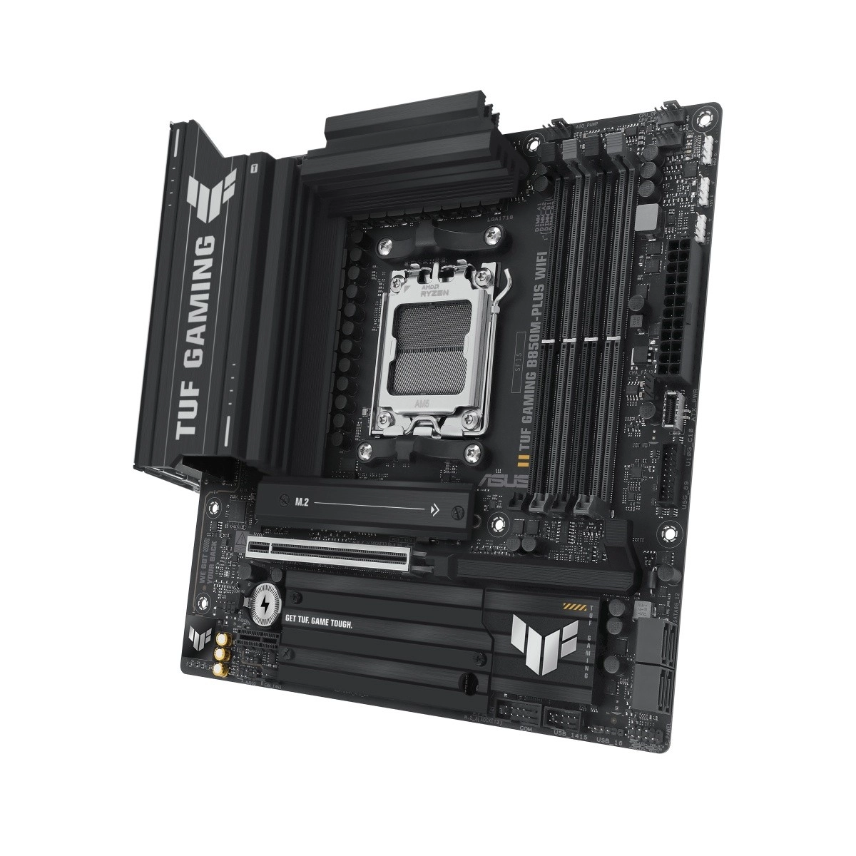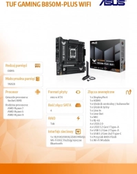 Bundkortet ASUS TUF Gaming B850M-PLUS WiFi kombinerer en holdbar konstruktion med komponenter i militær kvalitet, forbedret strømforsyning og omfattende køling for stabil ydeevne. Det tilbyder moderne tilslutningsmuligheder, understøttelse af de nyeste AMD Ryzen-processorer og en opsætning klar til krævende gaming og AI-applikationer.