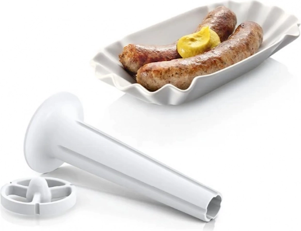 Medfølgende er et rivertilbehør til skæring og rivning af grøntsager, ost, nødder eller chokolade – uden begrænsning på mængden. Populær er tromlen til at rive kartofler til kartoffelpandekager. Det praktiske pølsehorn gør det muligt at tilberede hjemmelavede delikatesser præcis efter din smag – fjerkræ, svinekød, oksekød eller vegetarisk. REVERSE-funktionen frigør råvarerne ved eventuel fastklemning, så apparatet straks er klar igen.