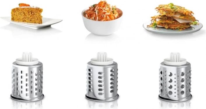 Praktiske tromler til skæring og rivning, inklusive tromle til kartoffelpandekager, samt et pølsefyldningstilbehør udvider mulighederne fra salater til hjemmelavede specialiteter.