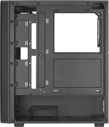 Det fuldt perforerede frontpanel maksimerer lufttilførslen, mens den gennemsigtige sideplade i hærdet glas viser komponenterne frem.