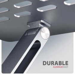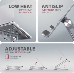 - Let og robust metalstruktur; skridsikre flader; flere positioner; højde op til 205 mm; justering af basis-hældning 180°–90° og arm 180°–90°; bedre varmeafledning; let at folde sammen