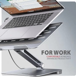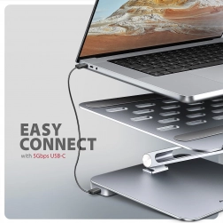 Elegant og robust konstruktion i aluminiumslegering giver passiv køling og stabilitet, mens skridsikre flader beskytter enheden mod ridser. Standeren med dobbelt hængsel muliggør præcis justering af højden op til 205 mm og hældningsvinklen, så skærmen flugter med en ekstern monitor. Hubben udvider din bærbare med HDMI 4K/60 Hz, 3x USB-A 5Gbps, RJ‑45 Gigabit og USB‑C PD-indgang 100 W.