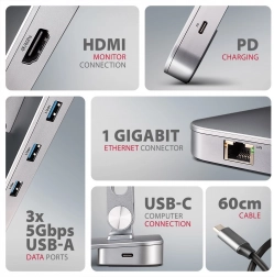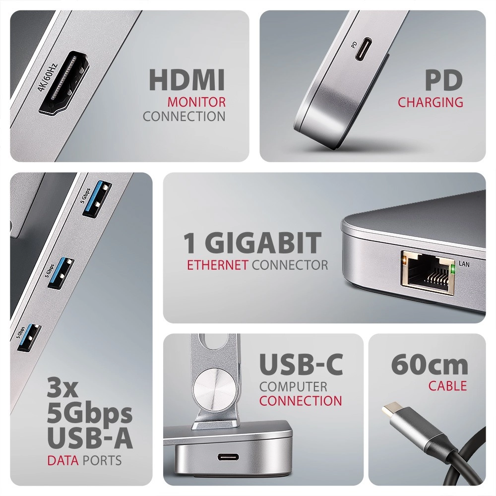 HDMI-udgangen understøtter op til 4K/60 Hz, 2K/120 Hz og 1080p/200 Hz inklusive HDR og multikanals lyd. USB-A 5Gbps håndterer eksterne diske (op til to samtidig), periferiudstyr samt opladning op til 7,5 W. Gigabit Ethernet sikrer en stabil netværksforbindelse, og via USB‑C PD 3.0 kan du oplade den bærbare med op til 100 W. Tilslutning er enkel takket være Plug & Play og Hot Plug.