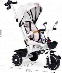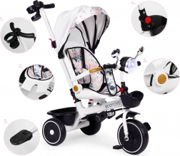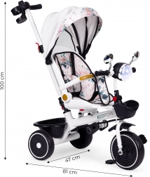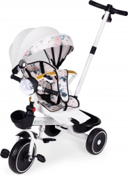 Forældre vil værdsætte fuld kontrol over kørselsretningen takket være forbindelsen mellem styrestangen og tricylens styr. Konstruktionen er designet til stabilitet (bred bagaksel), nem vedligeholdelse og lang levetid. Maksimal belastning er 25 kg, og tricyklen vejer kun 7,8 kg – en ideel ledsager til daglige gåture.
