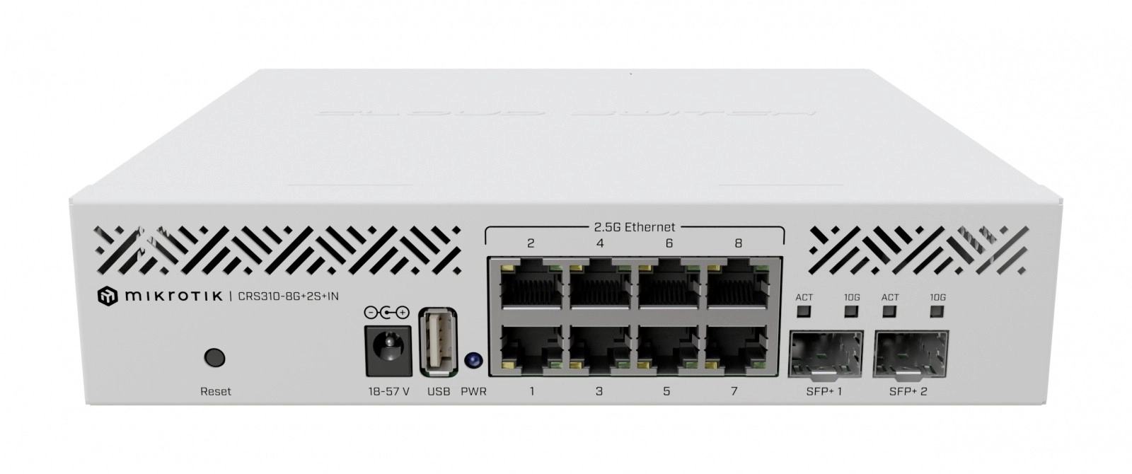 Den avancerede switch MIKROTIK CRS310-8G-2S+IN bringer højhastighedsforbindelse i et kompakt kabinet: 8× 2.5G Ethernet og 2× 10G SFP+ med understøttelse af flere hastigheder (1G/2.5G/10G). Dermed kan du fleksibelt kombinere links eller bruge den som et 10× 2.5G setup. Et ideelt valg til at opgradere eksisterende gigabit-infrastruktur til højere hastigheder.