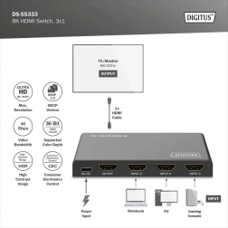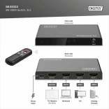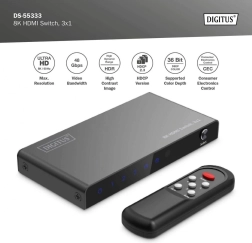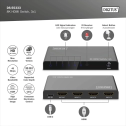 Den elegante og kompakte DIGITUS 3×1 HDMI-switch lader dig forbinde op til tre HDMI-kilder til én skærm. Ideel til vægmonterede TV, spillekonsoller, afspillere og computere – du behøver kun ét HDMI-kabel til skærmen og kan skifte kilde med fjernbetjening.