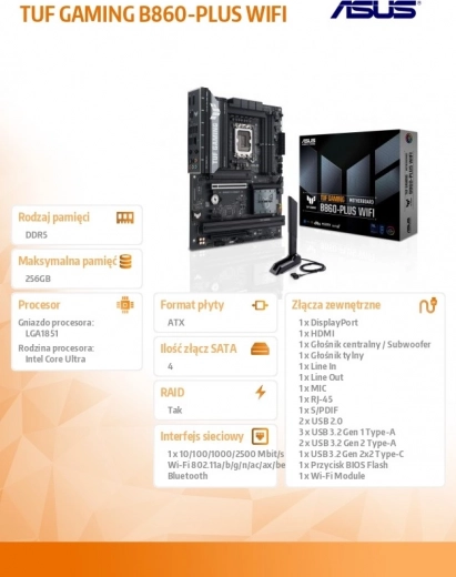 Asus TUF Gaming B860-PLUS WIFI Bundkort er den ideelle løsning for gamere og brugere, der kræver moderne teknologi. Det er udstyret med LGA1851-sokkel og understøtter Intel Core Ultra-processorer for uovertruffen ydelse og glathed. Intel B860-chipset sikrer stabil drift selv ved intensiv brug.