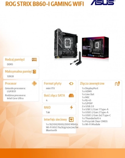 Kompakt og kraftfuldt bundkort ROG STRIX B860-I GAMING WIFI til de nye Intel Core Ultra (LGA1851)-processorer leverer topydelse i det lille Mini‑ITX-format. Det tilbyder hurtig DDR5-hukommelse op til 9066 MHz, moderne PCIe 5.0 x16, to M.2-slots, fire SATA 6 Gb/s, RAID-understøttelse og integreret Wi‑Fi til trådløs tilslutning – et ideelt fundament til både gaming- og kompakte arbejds‑PC’er.