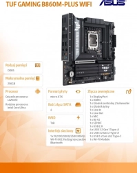 ASUS TUF GAMING B860M‑PLUS WIFI bygger på Intel B860‑chipsettet og tilbyder robust strømforsyning, effektiv køling og lang levetid. Med understøttelse af DDR5 op til 8800 MHz og en maksimal kapacitet på 256 GB leverer den jævn drift af krævende spil, multitasking og kreative applikationer.