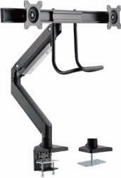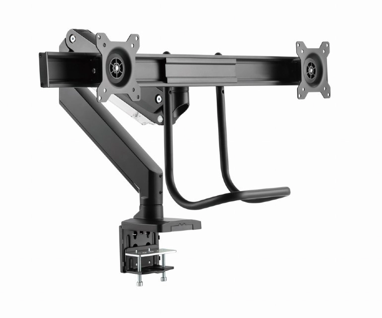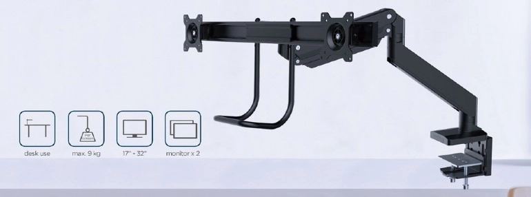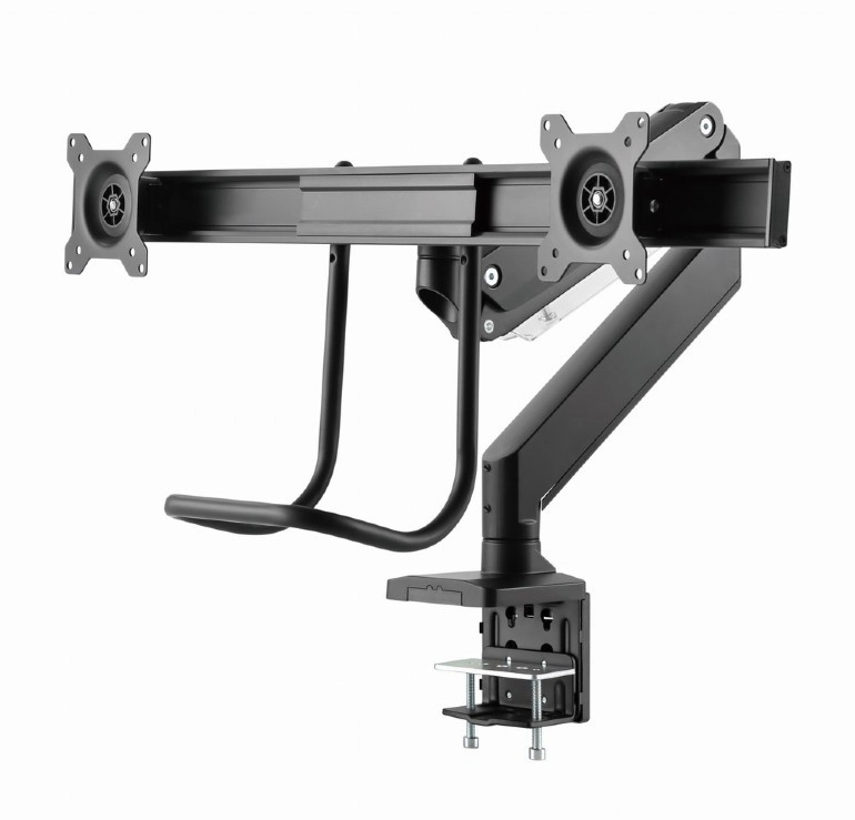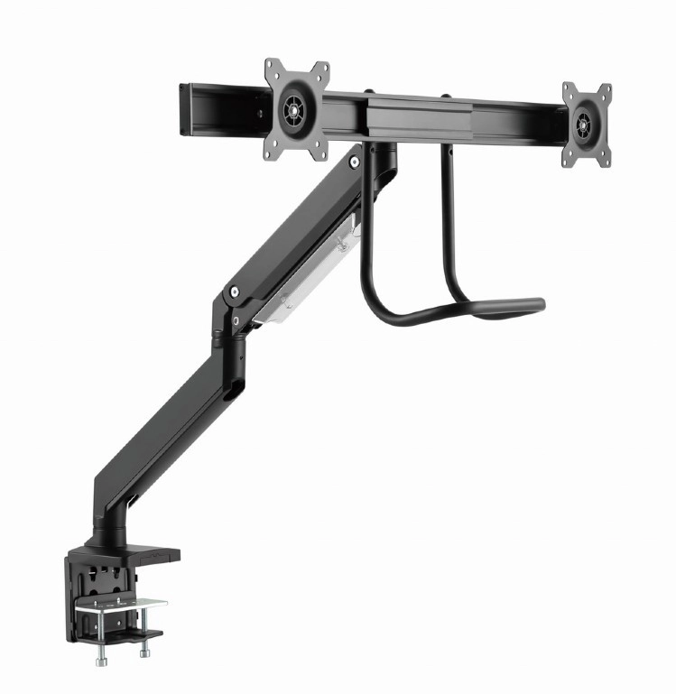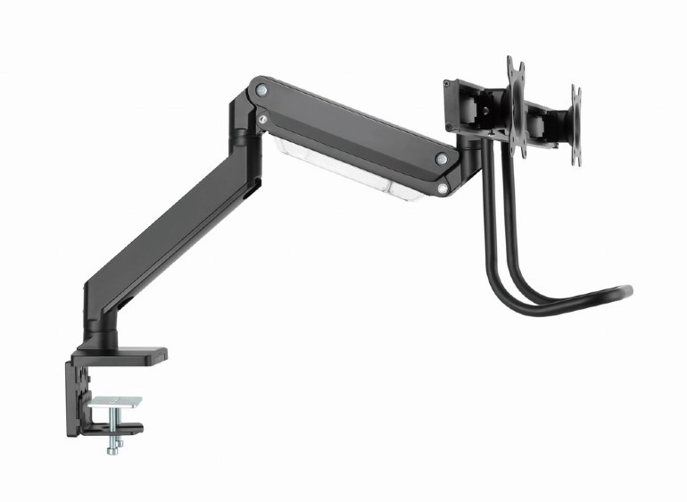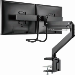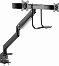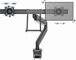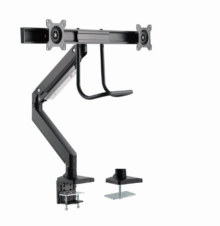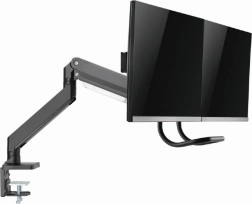 Frigør plads på skrivebordet og få en sundere arbejdsstilling med dette ergonomiske beslag til to skærme op til 32". Takket være gasfjedre justerer du højde og hældning med et enkelt tryk, drejelig og udtrækkelig arm muliggør ideel placering af skærmene side om side, og solid fastgørelse med klemme eller gennemføring sikrer stabilitet på ethvert bord.
